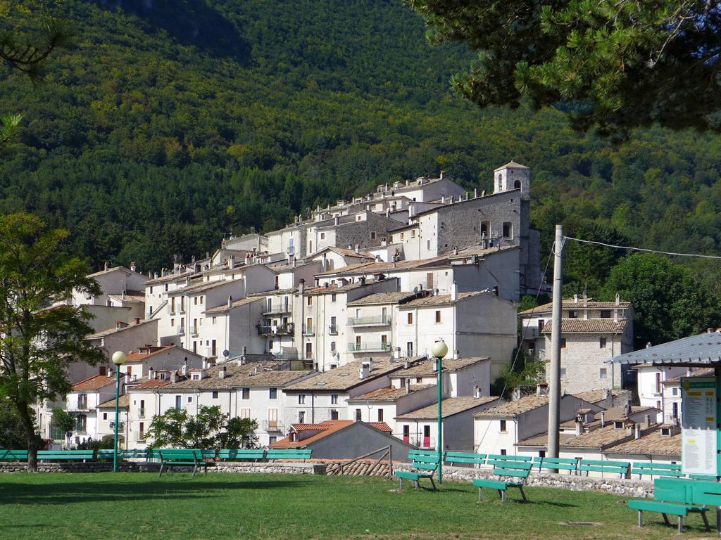 • Bänke am Rand des Kirchplatzes und Blick auf das alte Dorf Civitella Alfendena