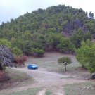 auf der kleinen ebenen Fläche ein Pferdestall mit Reitfläche