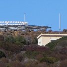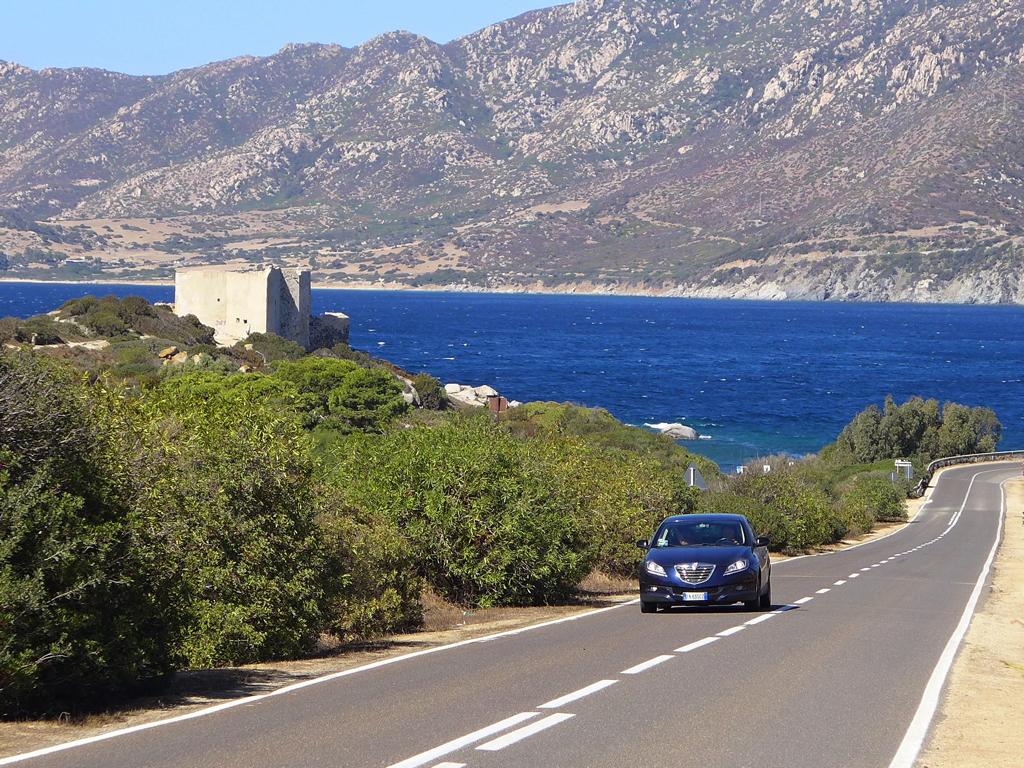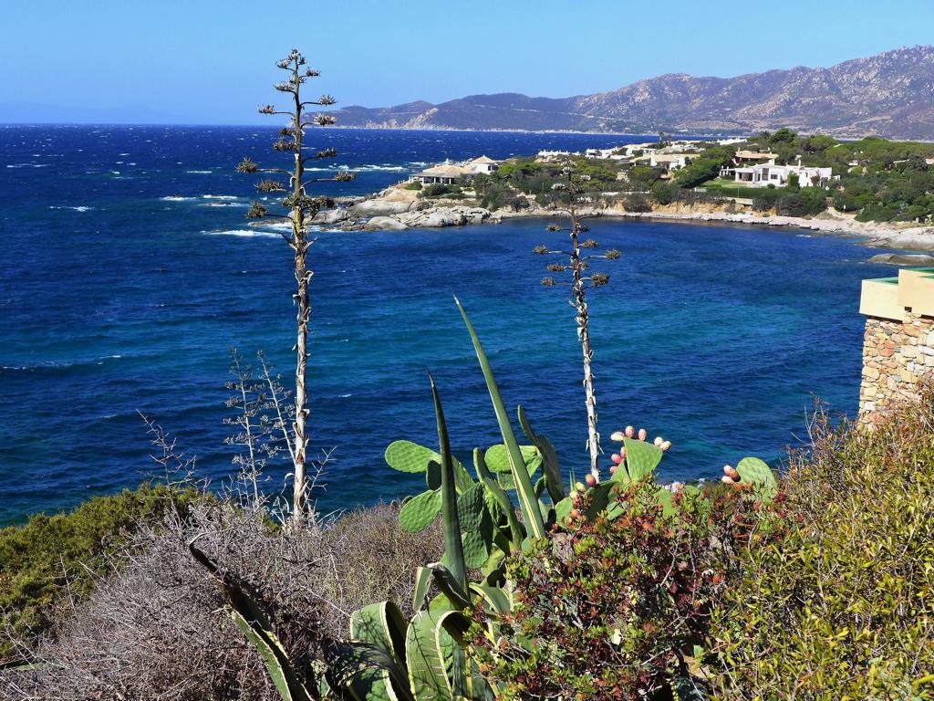 Blick über die Lagune Notteri auf eine Strandanlage an der Küste